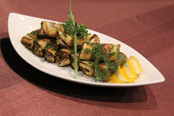 Oven baked eggplant slices rolled with a walnut, garlic, spices and herbs filling, topped with sour cream.